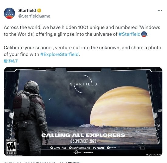 离《星空》发售的日子又近了一天。《星空》官推也在8月29日晚上开始了预热活动——在世界各地,他们隐藏了1001个独特且有编号的“世界之窗”,让玩家一睹《星空》的宇宙。