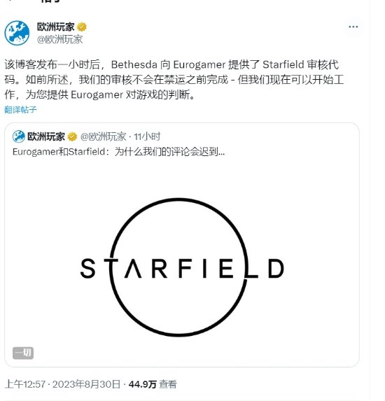 在发文公布此事后,Eurogamer在随后的一小时后拿到了评测码,但他们也表示《星空》评测会推迟,无法第一时间奉上。