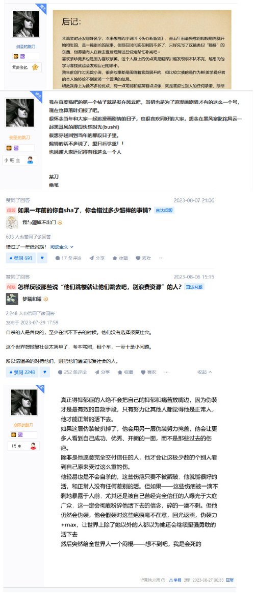 8月27日,贴吧ID为“剑圣的跳刀”的用户在百度“风云”吧留下了绝笔告别贴,发了最后一片小说,后记中写的是"但愿能有人在我去世后理解这些设定帮忙补完吧~",月初他也在知乎点赞了自杀相关的两个答案并关注了“自杀”吧。