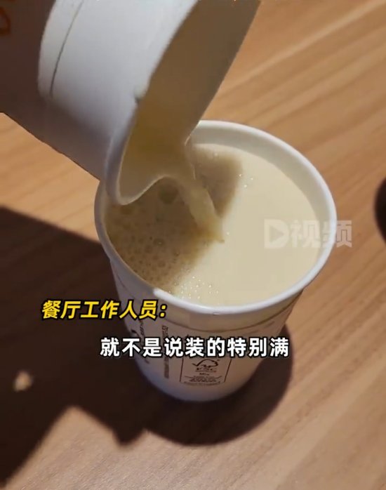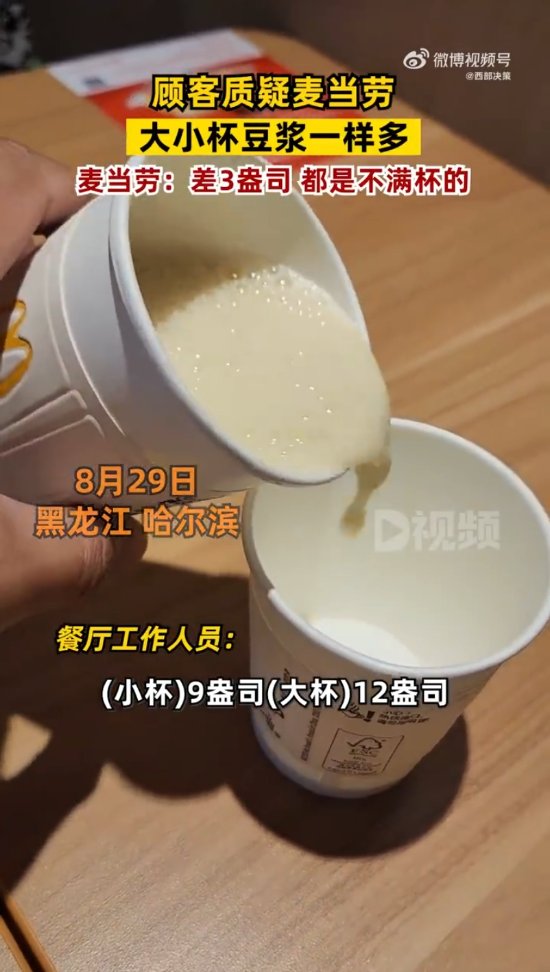 8月29日,黑龙江哈尔滨。男子发视频称,麦当劳大杯豆浆和小杯的量是一样的。