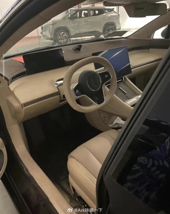 可以看到,该车内饰采用了双拼风格,大部分为褐色,且均使用了皮质材料包裹,彰显豪华感,内部设计风格较为简约,可以看到其配备有悬浮式全液晶仪表盘和大尺寸中控屏,其中前者远离驾驶位,目前不确定是否该车配备有HUD。