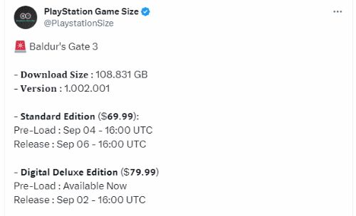 据博主介绍,《博德3》容量为108.831GB(版本号1.002.001)。游戏数字高级版现已开启预载,于北京时间9月3日零点解锁;普通版9月5日预载,9月7日零点解锁。