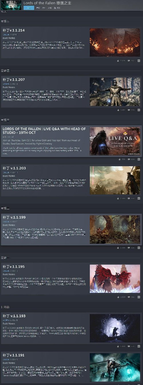 魂类游戏《堕落之主》自发布后一直在努力更新。从更新日志来看,自10月13日游戏正式上线以来,只有21日一天没有发布新补丁更新,其余每天都会有新补丁推出。