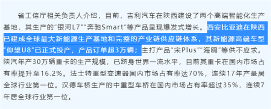 日前,据“西安发布”公众号,陕西省工信厅相关负责人介绍,西安比亚迪在陕西已建成全球最大新能源生产基地和完整的产业链供应链体系。