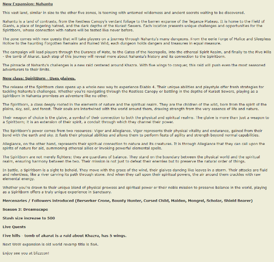 泄露内容显示,该DLC将增加《暗黑破坏神2》中的库拉斯特地区、新职业“Spiritborn”(以自然为主题)、NPC雇佣系统(多种职业、可配置装备及技能树)、腐化符文制作以及新的团队副本等内容。