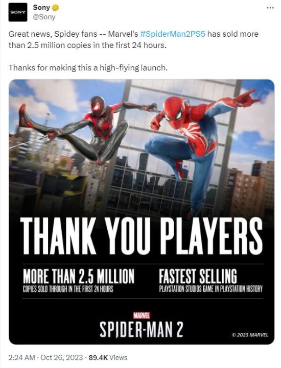 索尼官方今日(10月26日)也发文庆贺了此前的《漫威蜘蛛侠2》销量超250万份的消息。
