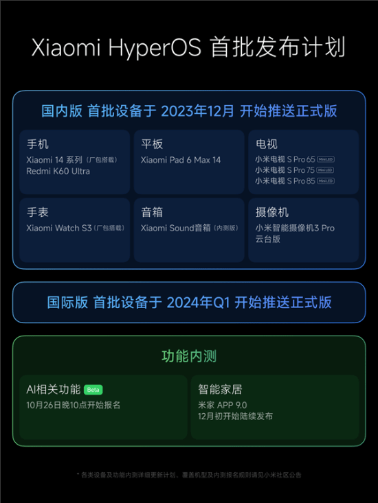 今晚的新品发布会上,小米官方公布了澎湃OS的发版时间表。据悉,国内版首批设备将于2023年12月开始推送正式版。国际版首批设备将于2024年Q1开始推送正式版。