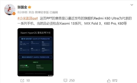 小米手机系统软件部总监张国全表示,这页PPT的意思是以最近发布的旗舰机Redmi K60 Ultra为代表的一系列手机,当然且必须包含Xiaomi 13系列,MIX Fold 3,K60 Pro, K60等。