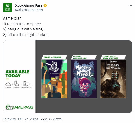 Xbox官推提醒,今日有三款游戏加入XGP,分别是《死亡空间:重制版》、《Frog Detective: The Entire Mystery》和《Mineko's Night Market》,感兴趣的玩家可以玩起来了。
