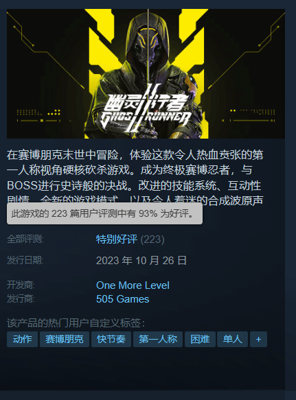 跑酷砍杀游戏《幽灵行者2》已经于昨日正式发售,目前本作Steam评价为特别好评。223篇用户评测,好评率为93%。