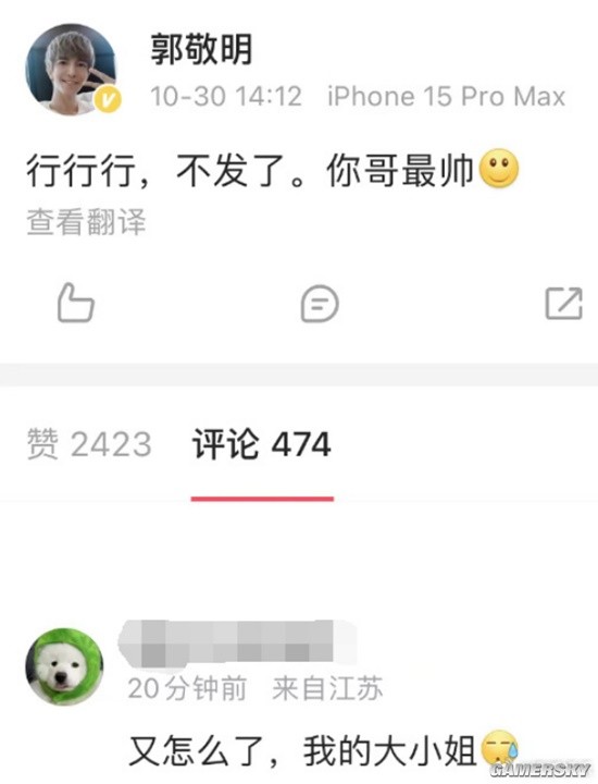 然而,他很快便删除了这条动态,并留网友:“行行行,不发了。你哥最帅”。有网友猜测是因为在评论区受到了粉丝的指责,而郭敬明也在评论中回应:“好的以后不发了”。