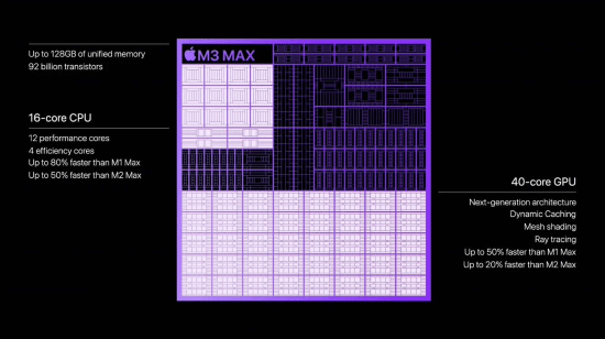 M3系列芯片采用全新的GPU,具有行业首创的动态缓存功能,支持网格着色渲染以及硬件级光线追踪加速。支持H.264、HEVC、ProRes、ProRes RAW等多种编解码器。