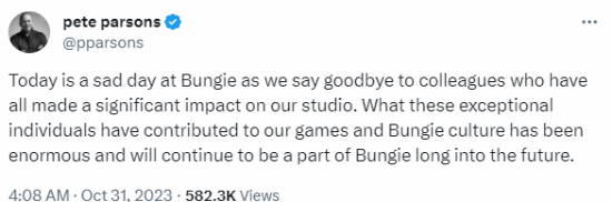 帕森斯表示:“今天对Bungie来说是悲伤的一天,因为我们要向那些对我们工作室产生重大影响的同事们告别。这些杰出的个人为我们的游戏和Bungie文化做出了巨大的贡献,并将在未来继续成为Bungie的一部分。”