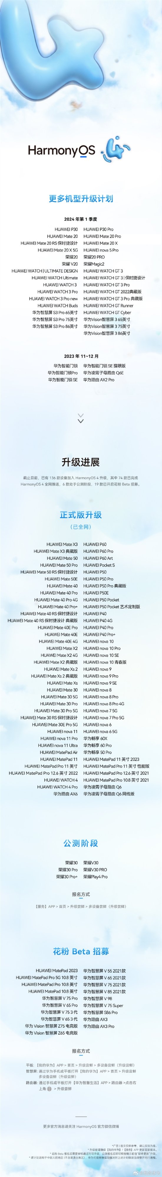 同时,华为宣布Mate 20、P30等12款手机将于2024年第一季度开启鸿蒙OS 4升级。