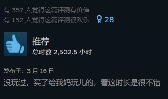耐玩必然是很重要的原因,我们可以在评论区一探究竟:有玩家的游玩时间超过2500小时——“买了给我妈玩的,看时长是很不错”