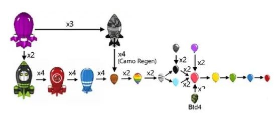 《气球塔防6》的进阶第二步,需要认识不同种类气球——这一点可能相对于我们随时可以查看技能树的单体熟悉来说困难一些,这里可以给一个简单的图示关系——基本上各个颜色的气球,越靠右越弱,越靠左越强,×数则代表击败之后分裂的变化趋势。