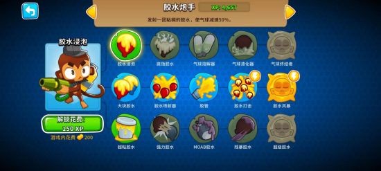《气球塔防6》几乎是一直伴随着解锁和积累:最初是角色的解锁,但角色解锁仅仅是角色养成的第一步:每个角色有三条分支路线可以养成,参战即可获得经验值。达到需求之后就可以解锁对应技能,后续的技能要求经验很高,不过这是一种永久性的解锁。