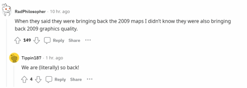 而评论区则有玩家表示:“当他们说要带回2009年的地图时,我没想到他们也会把09年的画质带回来。”