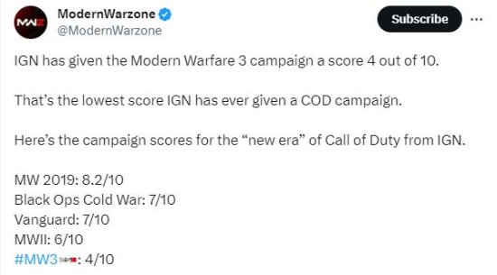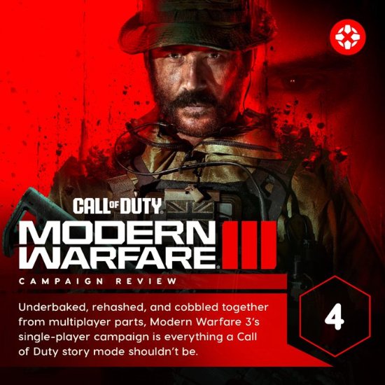 据《使命召唤》博主@ModernWarzone 总结,IGN给历年《使命召唤》战役模式的打分越来越低,今年IGN打出4分,这也是IGN给《使命召唤》战役模式打出的最低分。