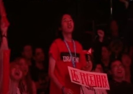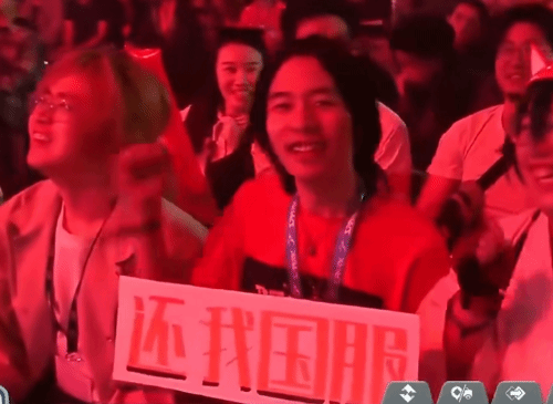在今早的《守望先锋》世界杯比赛中,导播多次将镜头给到现场的一名中国观众,该观众手持横幅,其上写着四个大字“还我国服”。