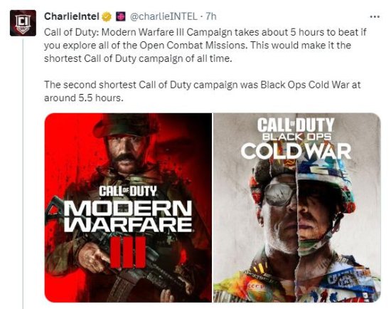 据《使命召唤》博主@ModernWarzone表示,如果玩家探索完了所有的开放战斗任务,那么《使命召唤20:现代战争3》的战役模式只需要大约5个小时就能通关。这使其成为有史以来最短的《使命召唤》战役。