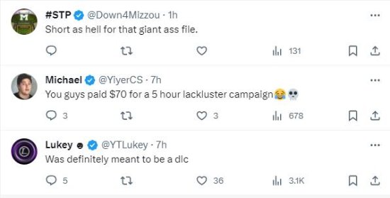 评论区里,玩家们也在纷纷吐槽这次战役太短了,也有玩家举例出了同样发布不久的《漫威蜘蛛侠2》,认为短点可以,但也需要精彩才行。