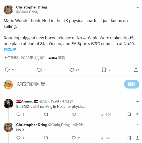 据GamesIndustry的主编@Chris_Dring消息,《超级马里奥兄弟惊奇》在英国取得了实体销量榜第一的成绩,《漫威蜘蛛侠2》则为第三名,新推出的《机械战警:暴戾都市》为第四名。《瓦力欧制造:超级舞动!》为第15名,比《星之海洋2 第二个故事 R》领先一名,《EA Sports WRC 》则为第19名。