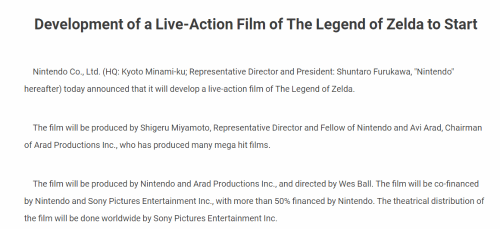 今日(11月8号),任天堂官方宣布,知名游戏《塞尔达传说》将被改编成真人电影,而最令人震惊的消息其实并不是《塞尔达传说》改编真人电影本身,而是任天堂还表示,这部电影将由自己和索尼共同出资,其中任天堂承担了超过50%的费用。