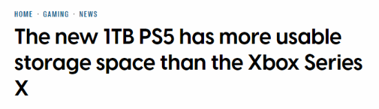 体积更小、配备1TB储存的新款PS5已在海外一些地区发售,据Digitaltrends报道,新款PS5的1TB储存剩余空间比XSX的要更多一些。