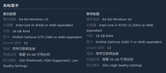 开放世界多人末日生存游戏《浩劫前夕》Steam页面更新了配置要求,最低GTX 1060显卡 16GB RAM,建议使用1080 Ti 16GB RAM。游戏大小为55GB。