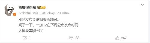 根据博主熊猫很禿然微博透露,一加会在下周正式公布一加12发布会时间,预计时间会是11月下旬。