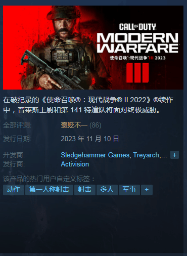 《使命召唤20:现代战争3》现已解锁,本体国区售价446元,金库版售价660元,支持简体中文。截至发稿,Steam评价为“褒贬不一”,好评率仅为47%。
