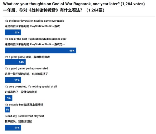 截止发文前已有1264人投票:超半数玩家都认为本作是有史以来最好的PS第一方游戏/之一,而给出差评的玩家仅占6%。