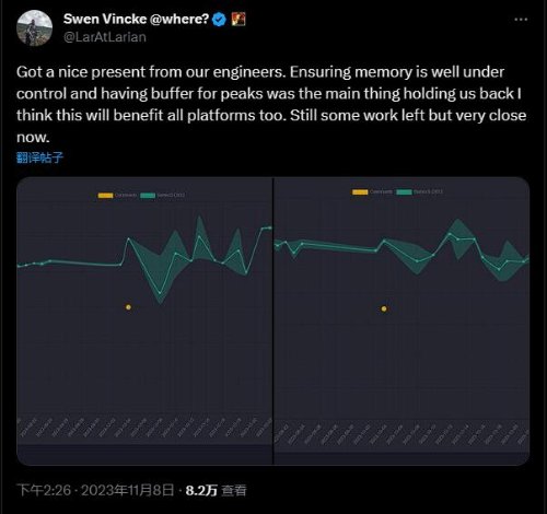 拉瑞安工作室的Swen Vincke在X平台上分享了这个好消息,通过两张图表显示了《博德之门3》Xbox Series S系列端口的RAM和VRAM负载是如何显著减少的。