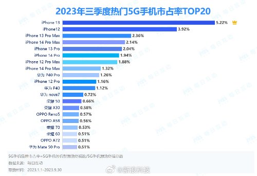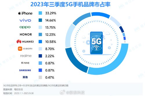 如上图所示,本季度5G智能手机品牌市占率排名较上季度未出现变化。iPhone在国内5G市场的份额进一步扩张,达到33.29%。目前来看,iPhone在上季度通过价格策略获得的市场份额优势正在继续;vivo、OPPO在国产5G手机品牌中也持续保持领先优势。不过,三季度末,各品牌纷纷推出新机,尤其是华为Mate60系列一经推出就备受关注,这也为四季度各大品牌的新表现带来了更多想象空间。