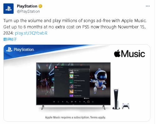 索尼PlayStation宣布即日起至2024年11月15日,玩家在PS5上登录Apple Music,就至少能够获得五个月的免费服务。