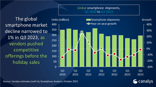 全球市场来看,2023年Q3小幅下降1%至2.946亿部,表明其下降速度有所放缓。在地区经济复苏和新产品升级需求的推动下,智能手机市场在销售季节到来之前的第三季度实现两位数的环比增长。