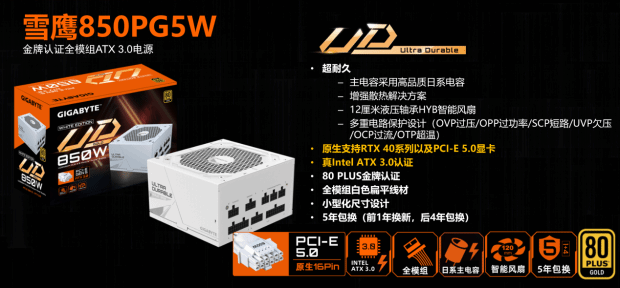 目前RTX 40系列显卡越来越普及,由于新一代显卡普遍使用PCI-E 5.0标准的供电接口,因此与之搭配的PC电源也需要配套ATX 3.0的产品才行。有鉴于此,作为全球知名PC板卡品牌之一的技嘉专为用户推出了全新一代雪鹰850GP5W电源,不仅获得了严格的INTEL ATX 3.0标准认证,原生支持RTX 40系列以及PCI-E 5.0显卡,同时它还是一款纯白配色的小尺寸高功率电源,非常适合喜欢追求个性化装机的玩家,下面一起来了解下吧。