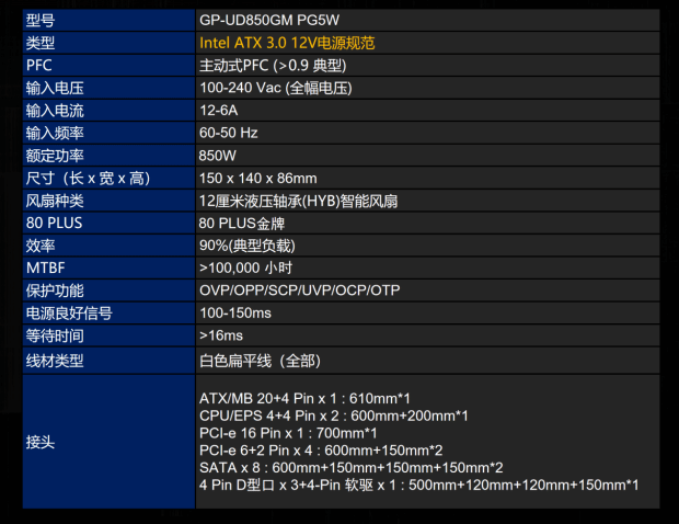 雪鹰850GP5W的主要各项参数都不俗,典型负载转换率超过90%,并且支持100~240Vac的宽幅电压,不惧电压不稳定影响。为了让整个电脑系统能够能稳定的运行,雪鹰850GP5W对OCP-过电流、OTP-超温、OVP- 过电压、OPP-过功率、UVP-欠压及SCP-短路等多重保护功能设计。电源通过了全球包括中美欧等在内的10个国家与地区的安全规范认证,可靠性值得信赖。