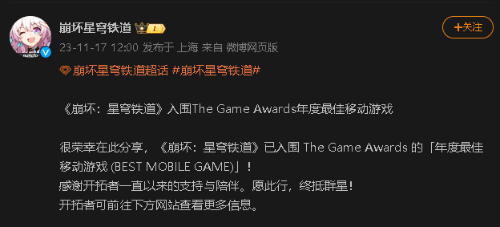 今日(11月17日),《崩坏:星穹铁道》官博发文庆祝游戏入围2023 TGA「年度最佳移动游戏」,并向广大玩家长久以来的大力支持致谢。