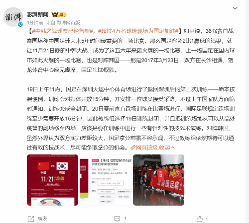 据澎湃新闻消息,中韩之战球票已经售罄,超过4万名球迷现场为国足加油。