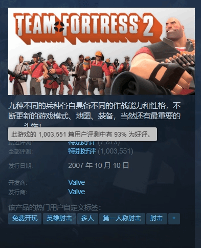 1003551条评价中,《军团要塞2》的好评率高达93%。截至撰文,近三十天共有7873条用户评价,好评率同样为93%。