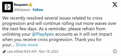 Respawn 表示,它已经“解决”了《Apex英雄》最近上线的游戏进度跨平台问题并告诉玩家不要接触和@PlayApex账户的关联。游戏进度跨平台能让玩家在所有平台上通过单个EA账号访问他们的游戏数据、饰品以及货币。