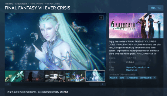 《最终幻想7:永恒危机》PC版Steam页面现已上线,发售日期待定,锁国区,不支持中文。该游戏是手游的PC移植版。