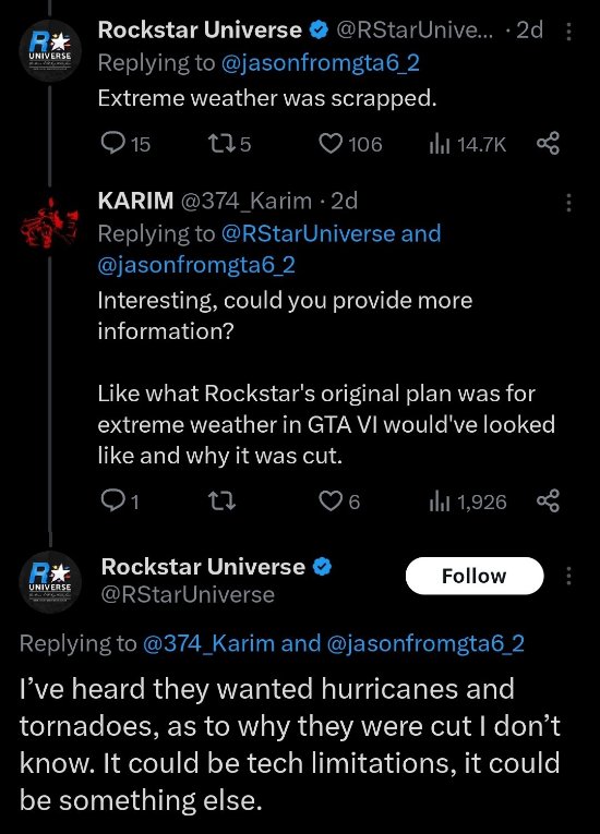 但据RockstarUniverse最新消息,极端天气系统可能已被删除,可能是技术限制,也可能是其它原因,详细原因并未说明。