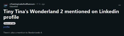 据一名Gearbox开发者的领英个人资料显示,他参与了《无主之地4》和《小缇娜的奇幻之地2》这两款尚未正式公布的游戏。前者此前曾被泄露,但这是后者第一次被泄露。