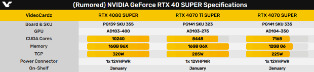 其中RTX 4080 Super将采用AD103-400 GPU核心,拥有10240个CUDA核心,256-bit 16GB GDDR6X显存,整卡功耗320W;RTX 4070 Ti Super核心编号D103-275,拥有8448个CUDA核心,显存同样是256-bit 16GB GDDR6X,整卡功耗285W;RTX 4070 Super则采用AD104-350核心,CUDA核心为7168个,显存降至192-bit 12GB GDDR6,整卡功耗225W。