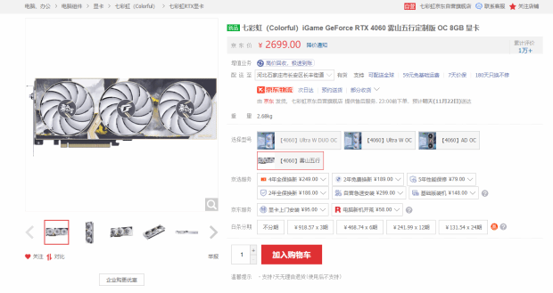 iGame RTX 4060雾山五行定制版OC 8GB显卡的当前价格为2699元。