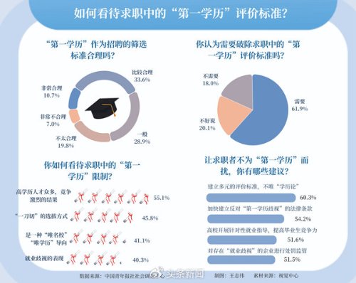 日前一项有1000名受访者参与的调查显示,55.1%的受访者认为这是高学历人才众多,竞争激烈的结果,45.8%的受访者觉得这是种“一刀切”的选拔方式,超六成受访者认为需要破除求职中的“第一学历”评价标准。参与此次调查的受访者中,在校大学生占33.9%,职场人士占63.0%,其他为3.1%。