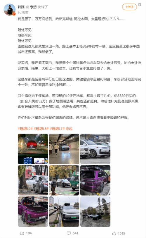 知名汽车博主韩路发文称,哈萨克斯坦-阿拉木图,理想的L7-8-9随处可见。他直呼:“路上基本上每3分钟就有一辆,密度甚至比很多中国城市还要高,我都傻了。”